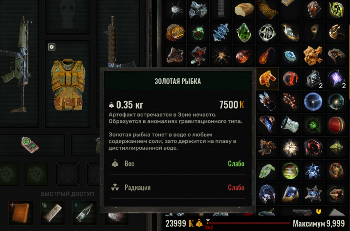 Описание: Редкий артефакт, формирующийся в гравитационных аномалиях. Интересно, что Золотая рыбка тонет в соленой воде, но способна оставаться на плаву в дистиллированной, что делает её уникальным объектом для исследований.