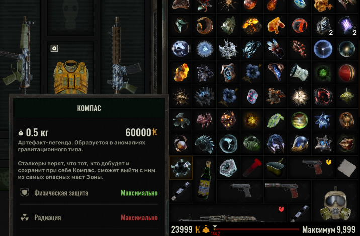 Описание: Этот артефакт является легендой среди сталкеров. Он встречается в гравитационных аномалиях и считается символом удачи и выживания. Сталкеры уверены, что тот, кто сумеет найти и сохранить компас, сможет выбраться из самых опасных уголков Зоны.