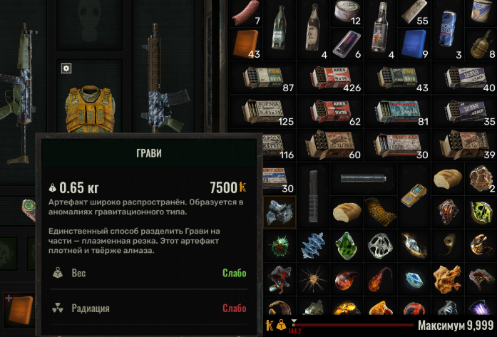 Описание: Этот артефакт является одним из наиболее распространенных среди тех, что формируются в гравитационных аномалиях. Благодаря своей невероятной плотности и твердости, он превосходит даже алмаз. Разделить Грави на части можно только с помощью плазменной резки.