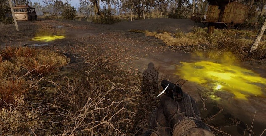 Эти яркие неоновые лужи токсичной зелёной слизи легко заметить на местности. Хотя они остаются неподвижными, приближение к ним на длительное время начинает наносить токсический урон. Для безопасного исследования таких зон рекомендуется использовать броню с высокой химической и радиационной защитой, а также подходящие артефакты.