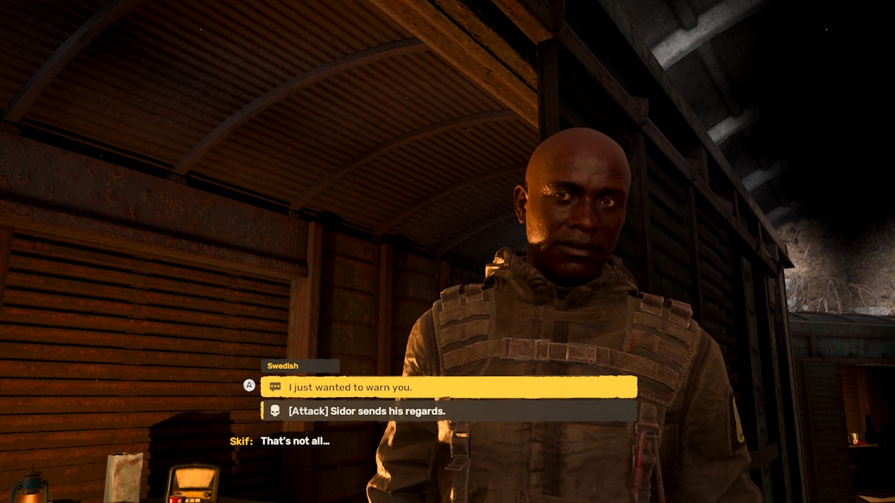 Если решите разобраться с Шведом силой, во время разговора выберите фразу (Привет от Сидора). В этот момент Швед и его двое бойцов моментально станут враждебными и атакуют вас.