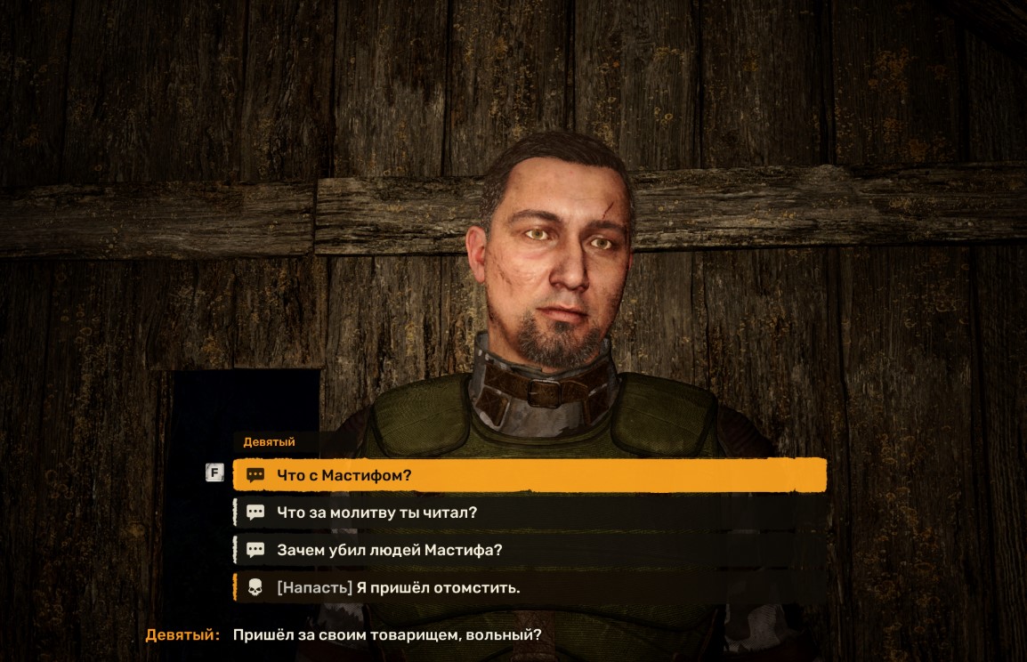Зайдя в дом, поднимитесь по лестнице на второй этаж и найдите Девятого. Он объяснит, что спас Мастифа и принес его сюда, чтобы оказать помощь. Девятый поделится подробностями произошедшего, заверяя, что действовал в его интересах.