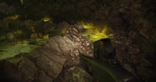 Внутри пещеры, усеянной ядовитыми аномалиями, осторожно двигайтесь, обходя опасные участки. Затем воспользуйтесь трубами как опорой и перепрыгивайте по ним, чтобы достичь скального выступа.