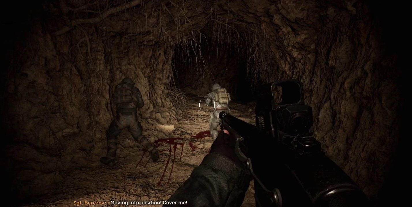 На выходе из пещеры к вам подойдет солдат, который начнёт стрелять после короткого разговора. Уничтожив его, вы сможете продолжить путь и встретиться с отрядом Браво.