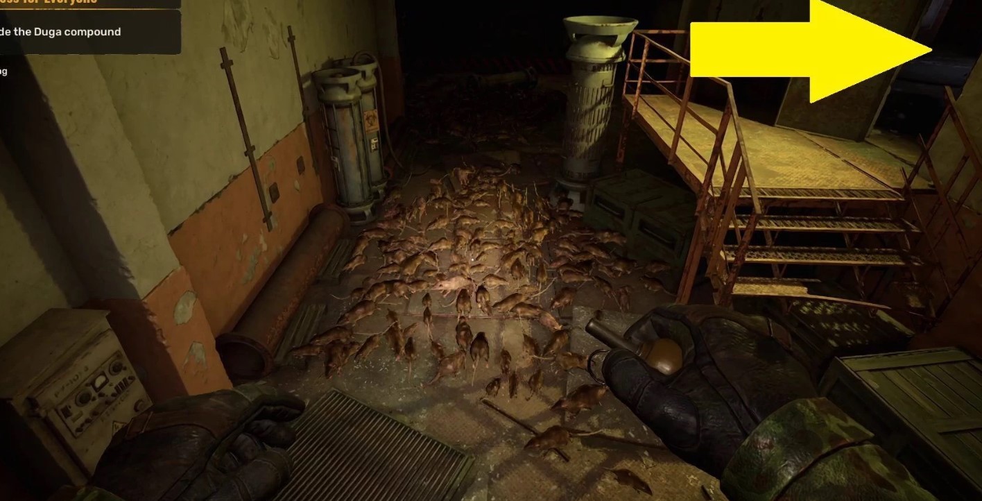 Перелезьте через ящики и проникните через пролом в стене. Вас ожидает встреча со стайкой крыс, поэтому заранее подготовьтесь, используя гранаты или подрыв ближайших бочек для эффективного уничтожения.