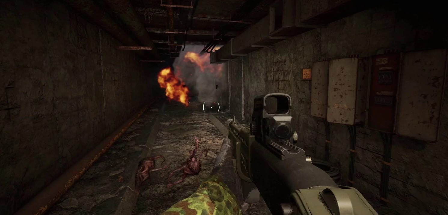 В железнодорожном туннеле будьте готовы к нападению мутантов. Уничтожьте их, используя доступное оружие, и продолжайте движение, повернув налево.