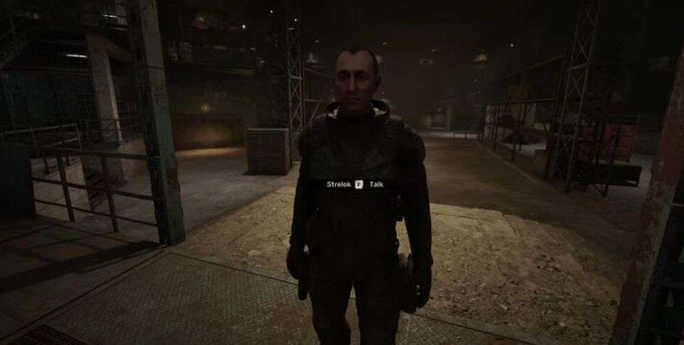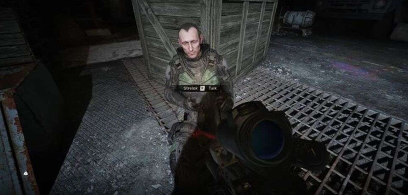 Как только грузовой лифт остановится, выходите и осмотритесь вокруг. Прямо перед вами будет сидеть Стрелок, прислонившись к ящику, он явно ранен и измождён. Подойдите к нему и завяжите разговор, используя все доступные варианты диалога.