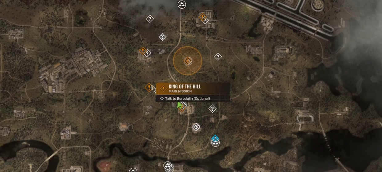 Чтобы проникнуть внутрь базы, нужно получить информацию, и её предоставит Бородулин. У сталкера есть свой уникальный способ развлечься: он позволит убегать и прятаться в течение 60 секунд, пока будет стрелять по герою. По истечении этого времени он передаст вам сведения о Рузвельте. Кроме того, вы получите точки на карте, которые помогут проникнуть на базу через трубы здания.