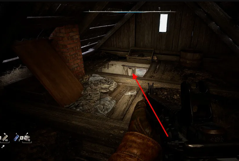 После этого снова выйдите из дома и покиньте пузырь, чтобы попасть в другую версию локации. Вернитесь в комнату — теперь там появятся ящики, по которым можно добраться на чердак.