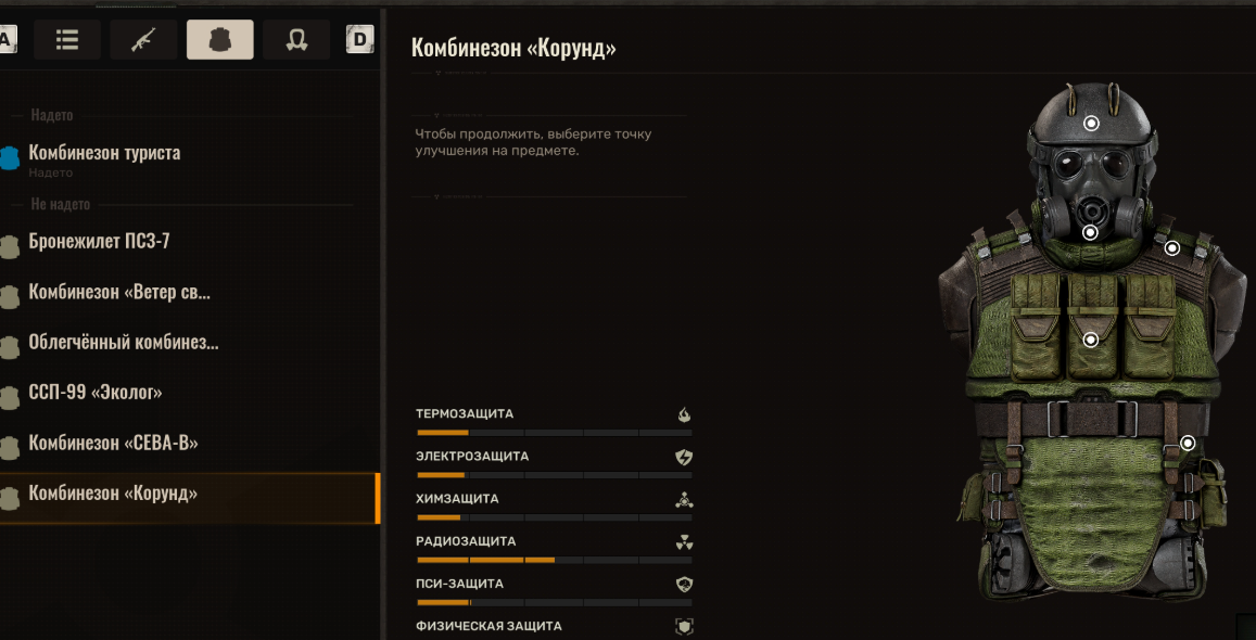 В этом разделе собраны все уникальные бронежилеты, комбинезоны, экзоскелеты, противогазы и другие виды снаряжения. Для удобства информация разделена по слотам в инвентаре.